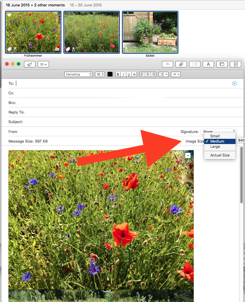 How does one vary the quality of an image sent by Mail from Photos? It was simple in iPhoto. Can images sent by Mail from Photos be organized sequentially up and down as they were in iPhoto rather than side by side