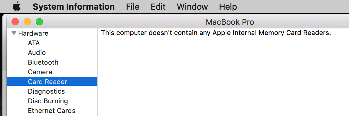 "Apple - About This Mac - System Reports - Hardware - Card Reader"