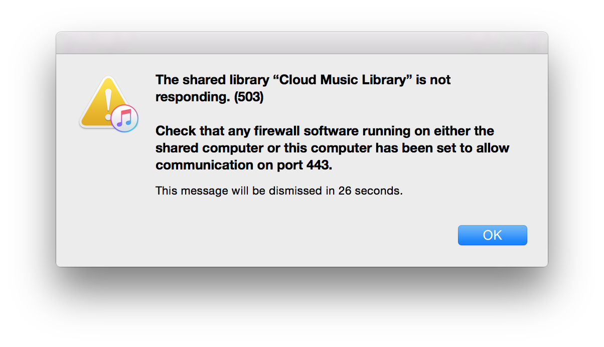 Not sure what the exact problem is, but not of the software on my Mac Pro is causing this problem. I do have both Apple Music and Music Match, so perhaps there is some error occurring there (or not). Same message: