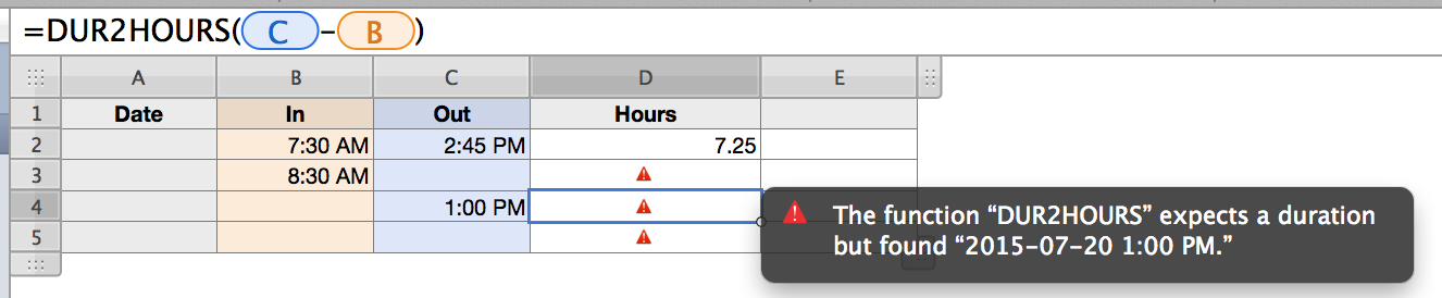 Apart from the error you're seeing which can be easily suppressed by appropriate IF() statement, you should be very careful when processing time value in Numbers. Actually there's NO time-only value but always date-time value in Numbers. And worse, if you input time without date, date is assumed to be the date of the input.