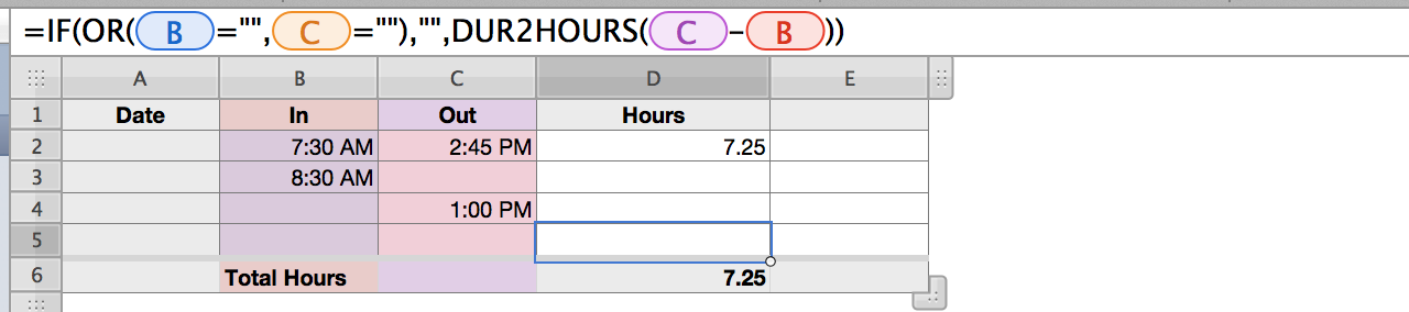 D5 =DURATION(,IF(LEN(B5)*LEN(C5)>0,MOD(TIMEVALUE(C5)-TIMEVALUE(B5)+1,1),0))