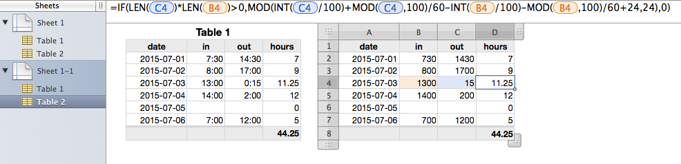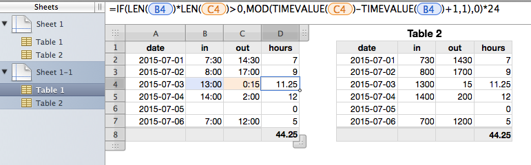 D7 =DURATION(,,IF(LEN(C7)*LEN(B7)>0,MOD(INT(C7/100)+MOD(C7,100)/60-INT(B7/100)-MOD(B7,100)/60+24,24),0))