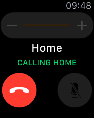 In order to get to the call and hang up I have to open the "Phone" app on the watch and there I just got the big red button, no volume settings.