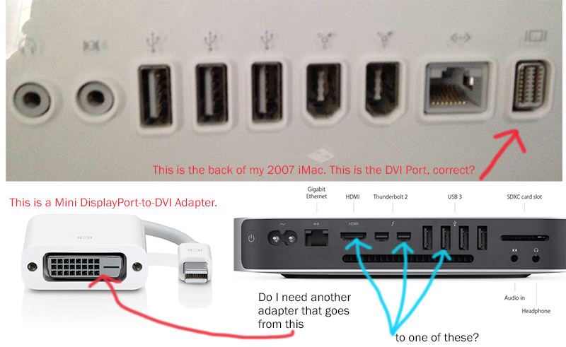 I have an old 2007 iMac that has a Mini DVI port. I've seen in other posts that you can connect a Mac Mini using this port. Is this correct? I've read that I need a Mini DisplayPort-to-DVI Adapter but when I look at these adapters online, I'm unclear as to how they attach to the Mac Mini. See my crude diagram below: