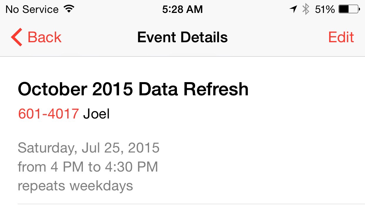 I have several conference calls I attend throughout the week and found myself late to several because I'd be listening to something on my iPhone using my Bluetooth headphones and miss the subtle popups from Windows 7 on my work PC. So I started adding them to my iPhone's calendar with reminders to pop up when the calls were to start. The thing is, they made it really hard to schedule a meeting that occurs every work day (Mon-Fri). You have to use the Custom option then choose "weekly" and select the days individually. Well, I've done that. It's to repeat every week on Monday, Tuesday, Wednesday, Thursday and Friday.. The thing is.. When I save the event and go look in my calendar.. it's appearing on Saturday as well! It's not like it's something that flows from one day to the next, it's a 30 minute event. How do I stop it from appearing on Saturday? Why can't we have a simple "Weekday" repeat option??