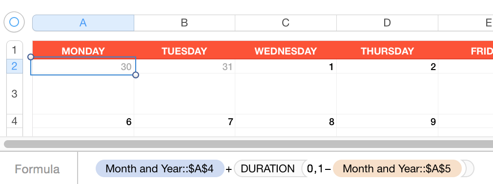 Then the other cells in the main calendar flow from that anchor value, cells to the right adding a day via =A2+DURATION(0,1), and cells below adding a week via =A2+DURATION(1)