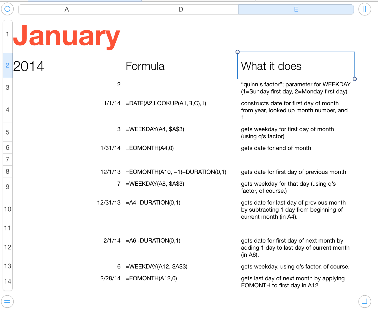 I don't feel like I really understand all of what they did with that calendar still. What I did notice is that every day is dependent on the one before and A2 has a unique formula that referers to the Month and Year table. Month and Year::$A$4 shows the first day of the month and year. Month and Year::$A$5 finds the WEEKDAY(date, first-day). and that pointed to A3. It was an interesting exercise is solving something without understanding all the steps between. The joy of a solution with the lingering unease of incomprehension. A great combination actually. If they really wanted to confuse us the could have made my so-called Day headings automatic and we could never have figured it out.