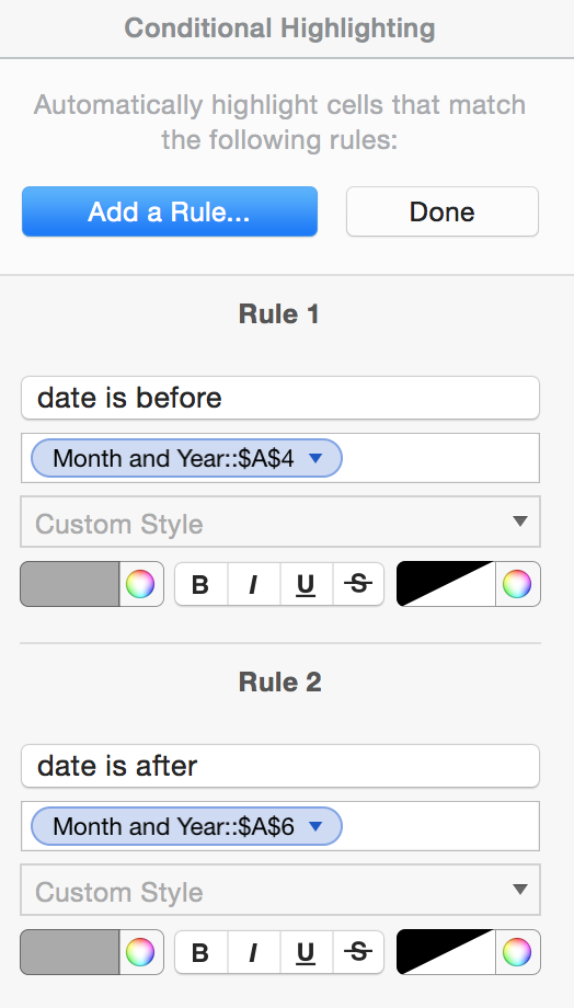 Also, have a look at Format Panel > Cell > Conditional Highlighting to see why some dates in the main calendar (last month, next month) are grey.