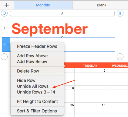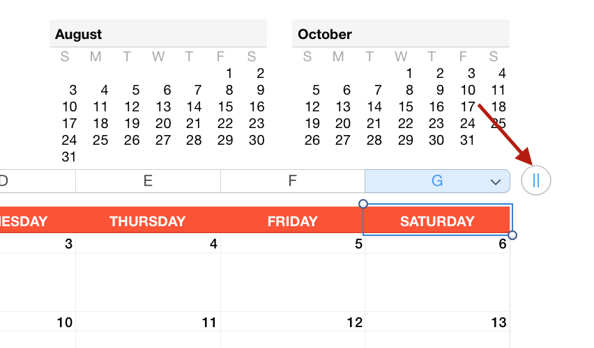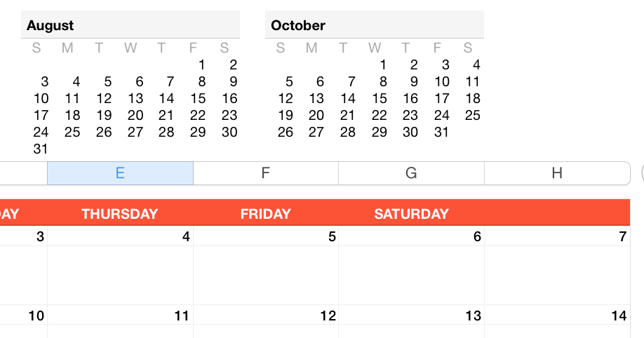 Then the other cells in the main calendar flow from that anchor value, cells to the right adding a day via =A2+DURATION(0,1), and cells below adding a week via =A2+DURATION(1)