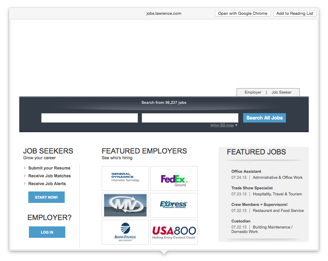 Image below is an example for job.lawrence.com link that was in email and opened using the preview down arrow next to link to preview page inside of Mail app.