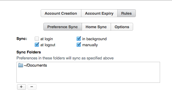Within Profile Manager I set up our Mobility / Home Sync settings to only sync specific directories such as Documents, Desktop etc as we did not want to be syncing each users whole home directory (way too large and unnecessary in our case). The sync was set to happen on logout, background and manually.