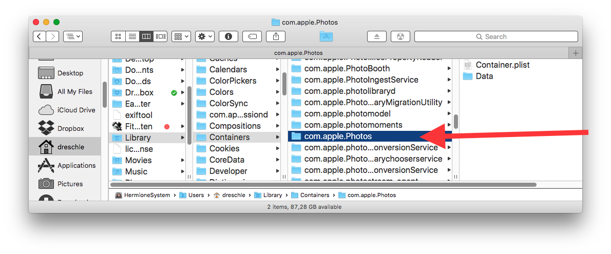 - Move the complete folder ~/Library/Containers/com.apple.Photos to your desktop. Move the entire folder, not just the contents.