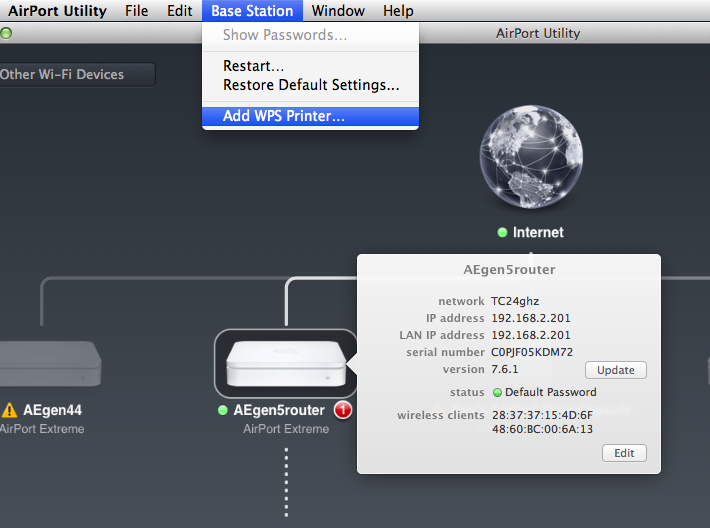 Running OS 10.10.4 on mid-2010 MacPro. I have a Comcast modem connected to the latest Airport Extreme. My new wireless Brother All-in-One printer and the computer recognize each other but I cannot print because I lack a WLAN access point for WPS or AOSS.