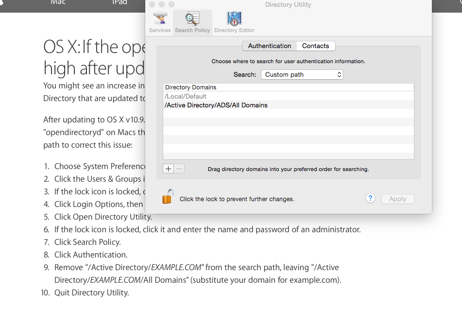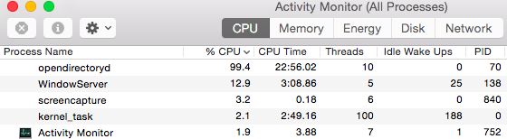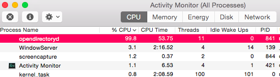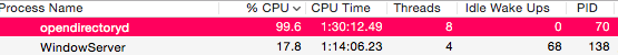 I find my mac air is easily getting hot even when I am not running any app. Following some instructions online, I found that the "opendirectoryd" takes up cpu around 90-101. Then, I tried the link OS X: If the opendirectoryd process CPU utilization is high after updating to OS X v10.9.5 - Apple Support. But this solution is not for me. I am really confused about this issue. Could someone help me out? Thanks a lot!