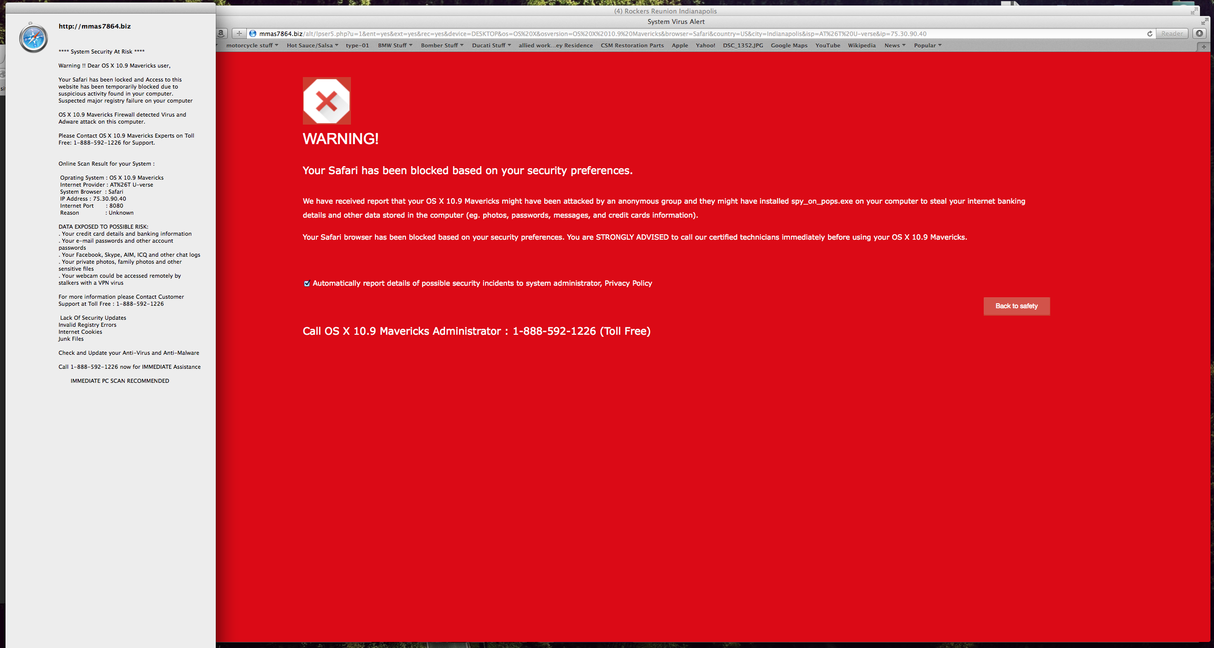 My Safari has recently been hit with some sort of virus that causes it to lock up and show the attached warning boxes. While locked-up it does not allow the windows to be closed, a new address to be input in the URL bar or any of the pull down menus to be accessed. Below are images of the windows while locked up. The first image is a pop-up that requires a clicking of the 'OK' button to get to the following red screen and subsequent pop-up window. I currently have no anti-virus software installed (I know, I know...) and could use some suggestions on which software may be best to help remove whatever virus/adware/malware this may be. Any suggestions on the specific kind of virus this may be would also be appreciated.