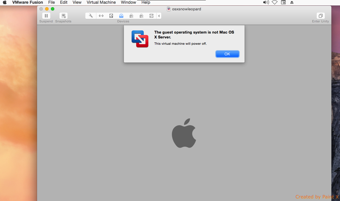 "the guest operating system is not mac os x server. this virtual machine will power off"