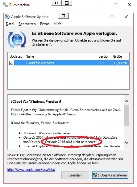 For the record, I’m running freshly installed Windows 10 with iCloud 5.0 and am getting the “Repair iCloud for Windows to use iCloud with Outlook” pop-up.