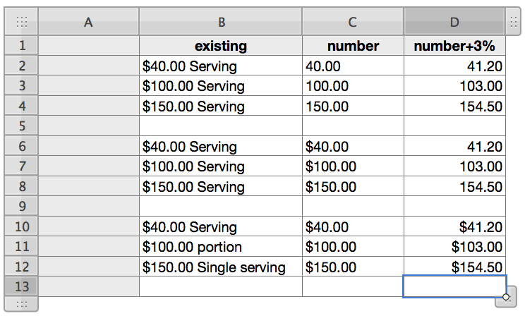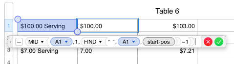FIND() locates the space and uses that count minus one for the string length in MID(). I could have used LEFT() and had a simpler formula but MID() would allow you to get rid of the "$" by changing the first "1" to "2". I kept the "$" because that lets Numbers know this is a currency You can get your 3% increase by multiplying by 1.03 either in this cell or in another one.