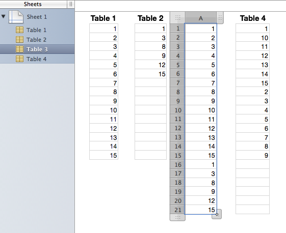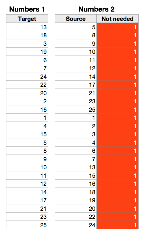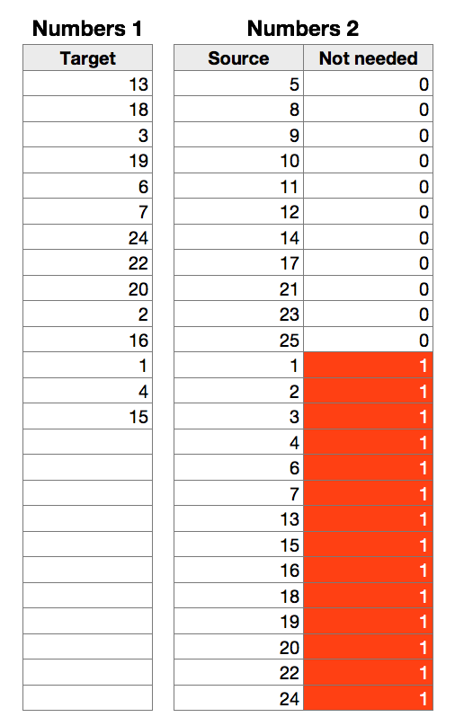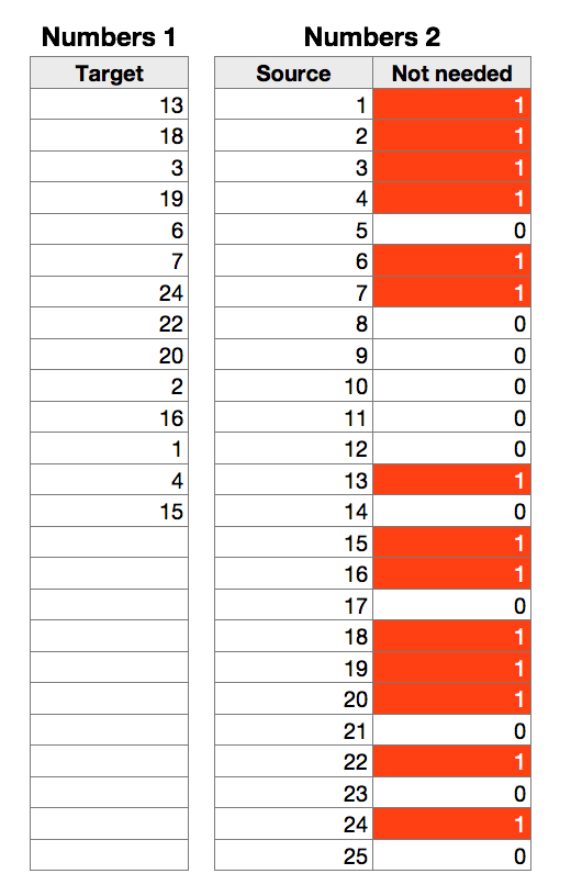 Got a great solution for my last question, hope you guys can help me out on this one. As the title says, I have two lists in two separate Numbers documents. One is a selected amount of numbers in a column, where as the second one is a full amount. Lets use an example: