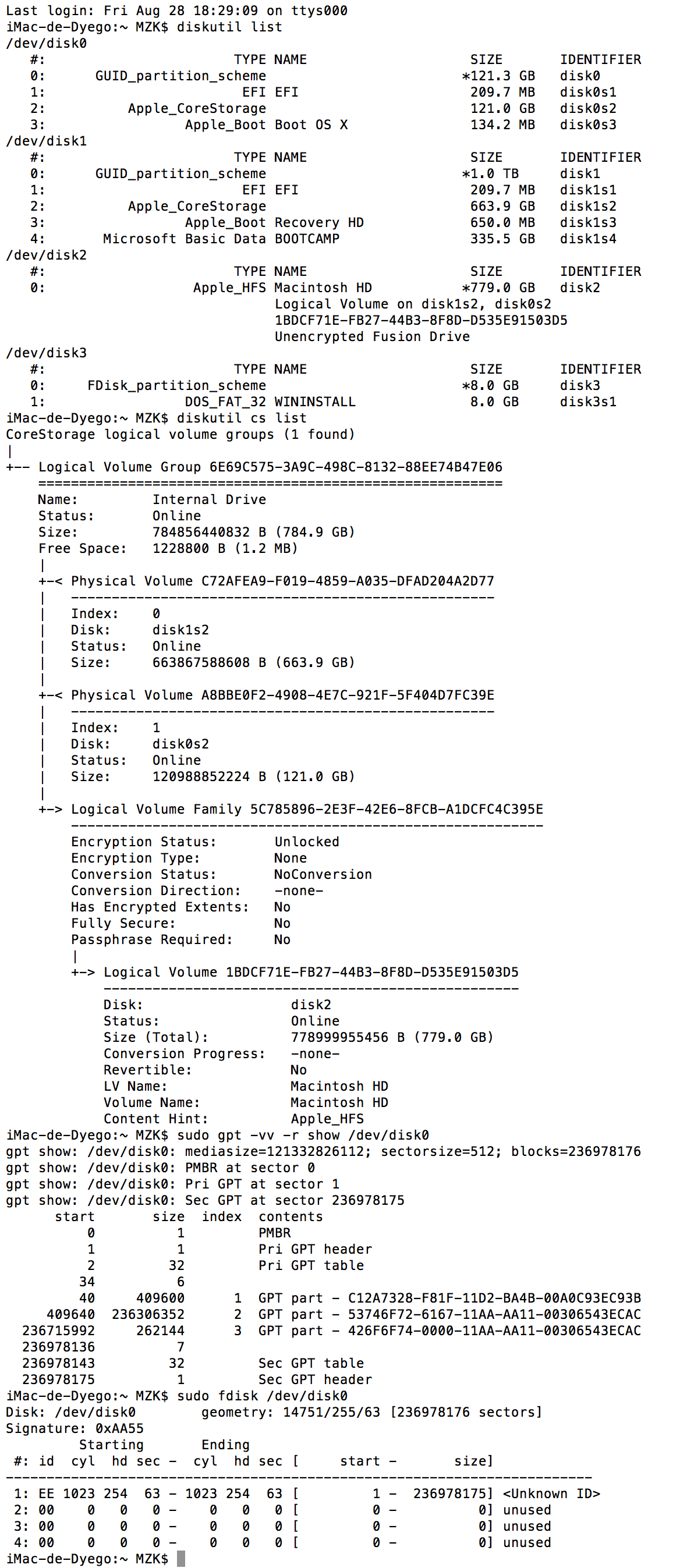 gpt show: /dev/disk0: Suspicious MBR at sector 0
