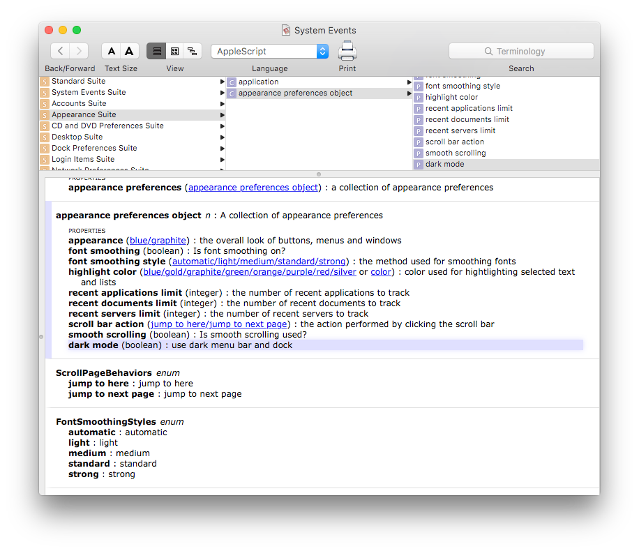 set properties to {scroll arrow placement:together at top and bottom, font smoothing limit:4, recent applications limit:10, scroll bar action:jump to here, double click minimizes:true, recent servers limit:20, appearance:blue, recent documents limit:20, highlight color:{0, 0, 32000}, smooth scrolling:true, font smoothing style:light}