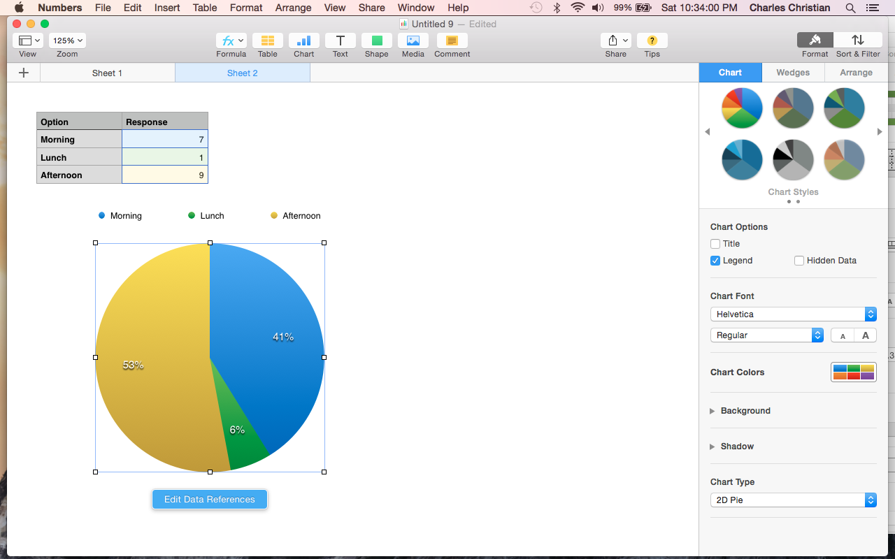 In numbers the you need to have a table designated for your pie chart. The columns need to be a header row and tyou need one Column A to be a header column; to do this you can choose format > table > header and footers. Your table will look similar to this, notice the darker rows are the headers.