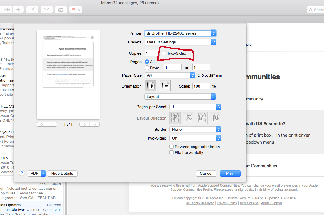 I have been trying to print double sided and watched many of the videos online about how to enable this option in Office, however, most of the videos were not from the latest OS and are outdated. Is there a different way to enable this setting on OS Yosemite? The option in Office is grayed out, and I need to figure out how to change the printer settings, but when I try to go through the System Preferences, and then Printers and Scanners, and Printer Queue, and Settings, there are no options relating to printing two-sided.