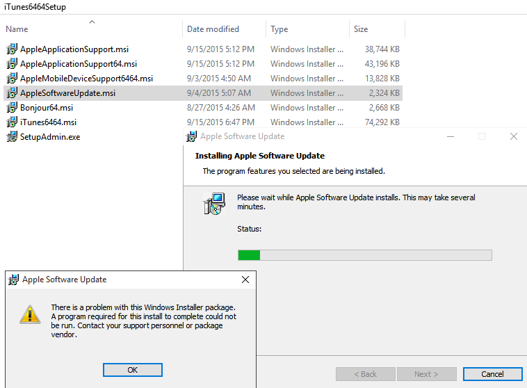 If the install still won't go through then double click the iTunes.reg file you made to restore the data to the registry, then use the method shown at Install missing components to unpack the installer of your previous iTunes installation and extract the .msi file you require. Double-click this to uninstall the component. There are links to recent builds of iTunes in the Older versions section of the user tip Troubleshooting issues with iTunes for Windows updates.