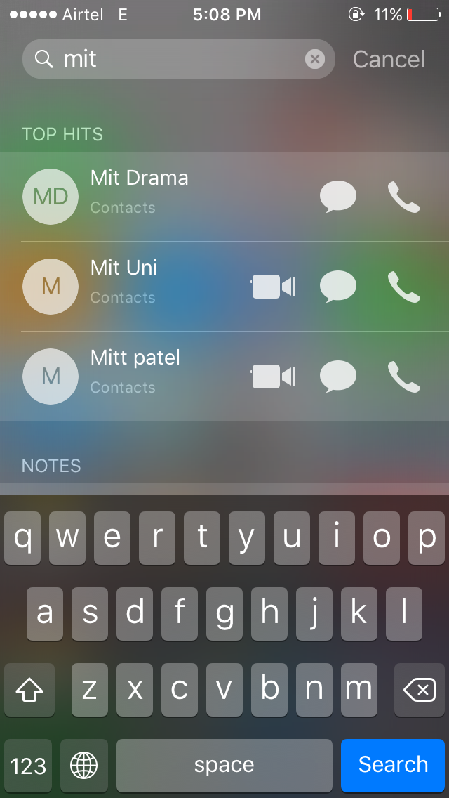 As we all know that, First In all ios , we can find contacts using spotlight search. But in ios9 it not help us to find contacts using spotlight search feature. Yes it finds birthdates, events, messages and mails of that contact name which we searching but if these details not filled in any contact by us then we can't be able to search that contact using spotlight.