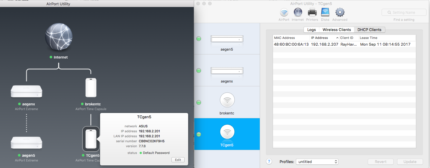 4. Use a real airport utility.. i.e. 5.6 on earlier Mac OS or even windows.. look up the DHCP client lists.