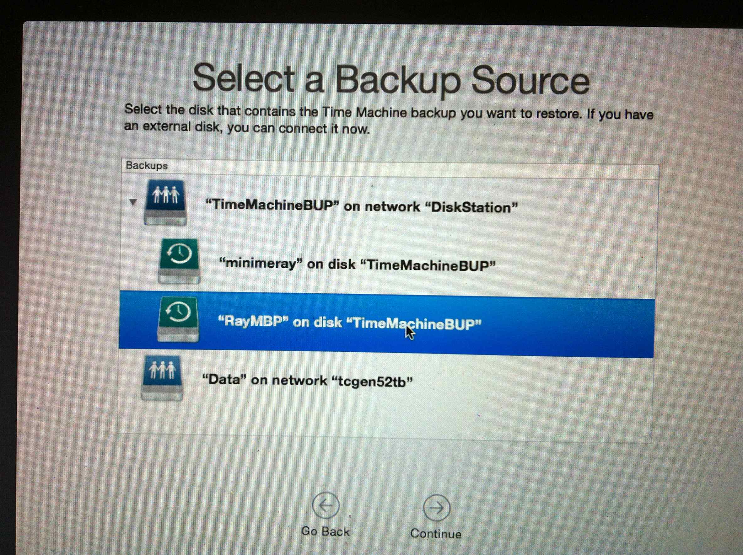 Pick the source and then pick the particular backup you wish to use. I have two different backups in the network resource I use.. Here are the screenshots I had to do with my iphone... the normal screenshot would not work so the quality is poor but gives you enough info to see what I did.. Note this is a completely new user importing all the old files from one of my previous backups on the Mac.. If you have issues.. tell me which screenshot you have issues with. And do what I did.. take a picture.. I can work from pictures.. I cannot work without info.