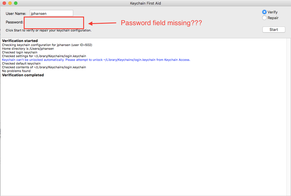 After installing El Capitan I have a BIIG problem.. For some reason the password field in first aid in Keychain Access is suddenly missing. I get the following error when trying to run it anyway:
