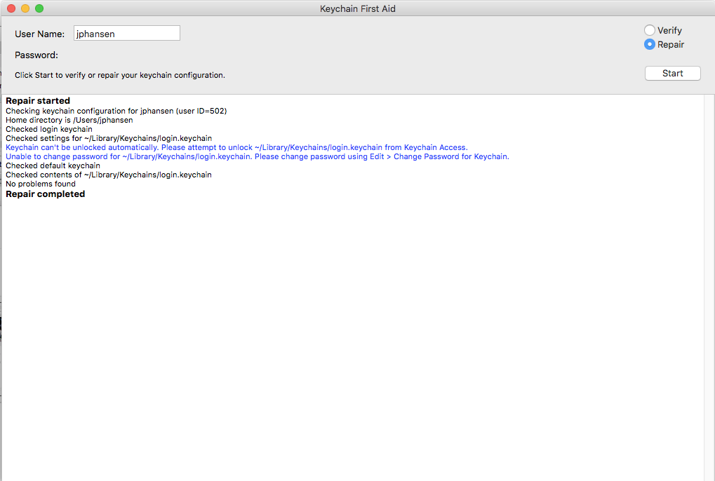 Would advise on not running "Repair" or even putting anything else in the "User" field other than what automatically appears, if you do you will get message stating Keychain First Aid has detected problems but is unable to repair, then if you run either Verify or Repair in the future even leaving what it auto infills in the User field you still appear to get the same error warning.