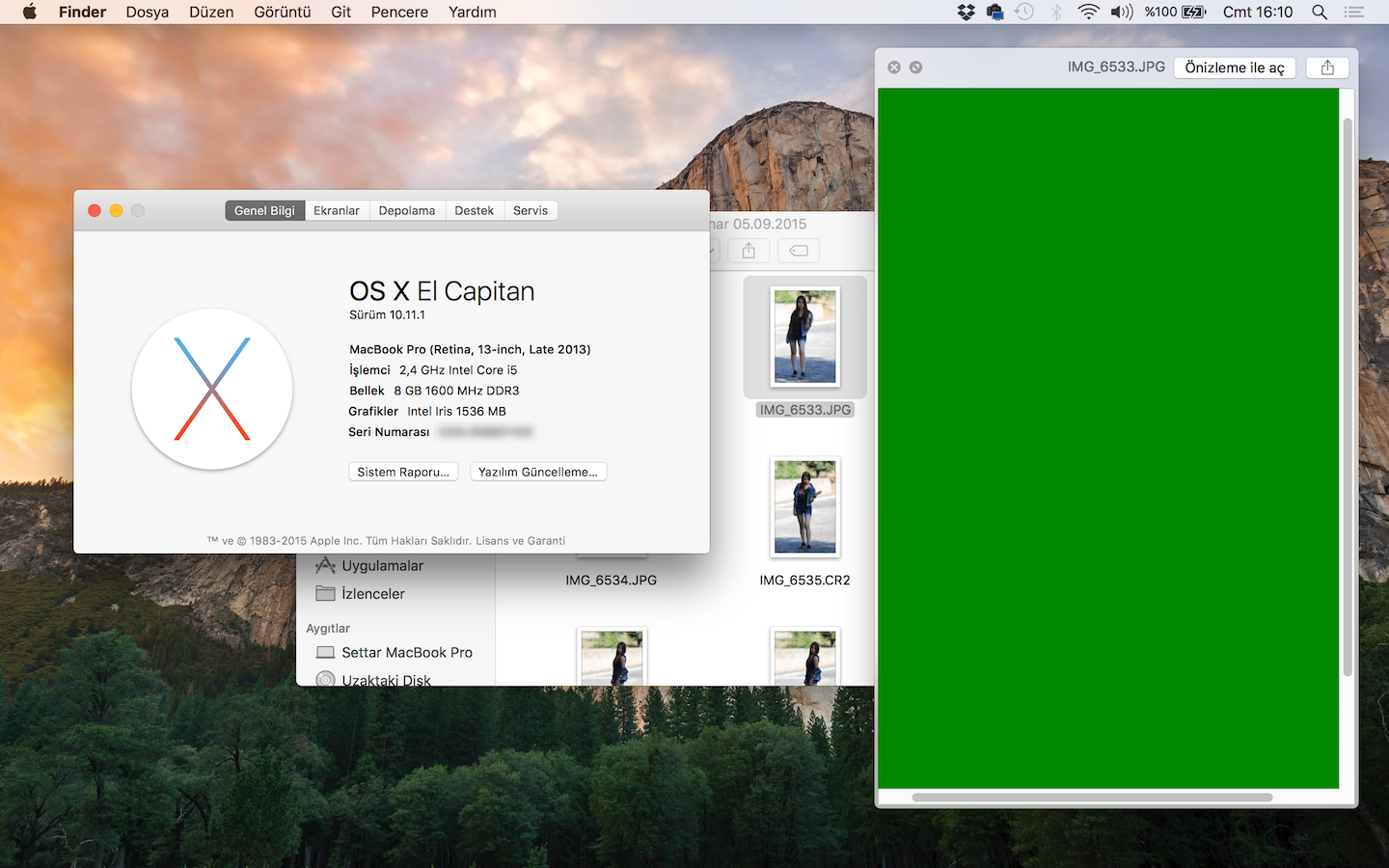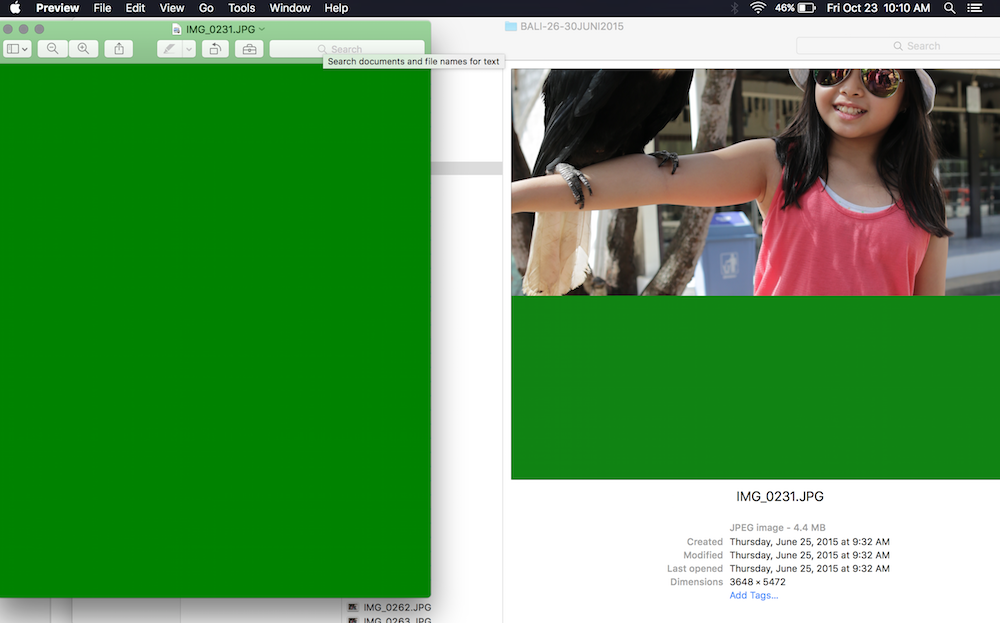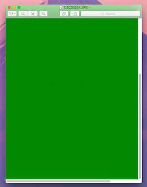 I have a Mac Mini late 2014 (8Gb RAM, Intel HD 5100) with OS X 10.11, the problem is when i open JPEG photos(not every JPEG, more detailed i'll explain below) in a Preview.app the screen of Preview.app turns green like you can see in a screenshot below, some it times also crashes, i'll leave the crash report at end of a message