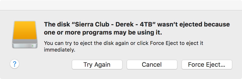 A bump to this thread. I’ve got 11 external drives that I use with two Macs, and I’m fed up with having to force eject them. I did not experience this in the early going with El Capital; it is a very recent phenomenon for me. As for some of the fixes mentioned, I use a USB 3 hub and that doesn’t help. I don’t want to have to reboot to accomplish something that shouldn’t be a problem, and I want Spotlight to search all of the disks.: at least 90 percent of my files are on the external drives. The phone company is not doing a great job with the software of its tiny computer division.