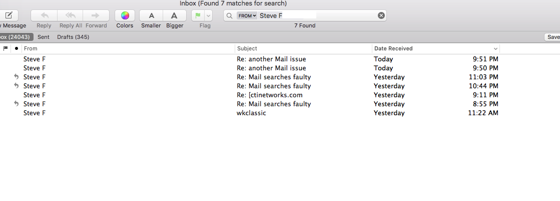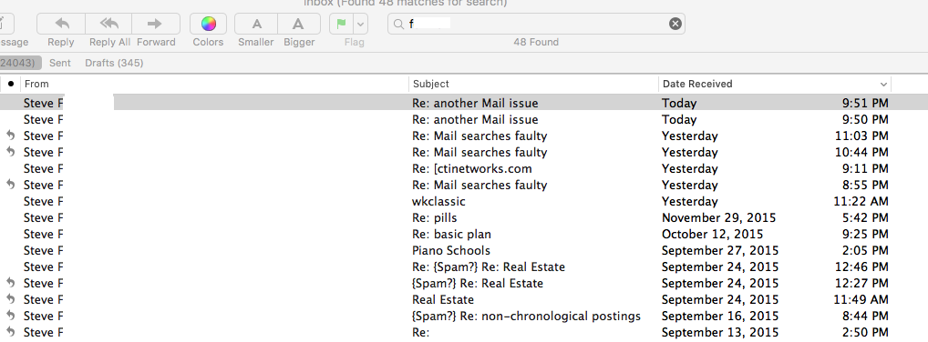 I’ve noticed that Mail can’t find things in searches. I.e., if you look for email sent to a particular person, it often says that it finds nothing. But then, if you find the email yourself manually, the message you found shows up in the search. I knew that I had written multiple times to someone recently, but Mail found only one sent message. When I found the messages from him, a couple of them had the reply arrows indicating that I had responded. When I clicked on those, my replies immediately showed up in the search results. In another instance, Mail was able to suggest a subject that included the word that I was searching on, but could not find the email associated with that title. Again, when I found it, then Mail was able to find it. This seems to a bug, and a fairly significant one, since being able to find messages is important. Any theory on what to do about this other than wait (pray?) for Apple to fix it?