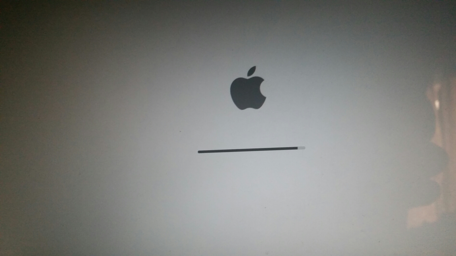 Early in the boot-up process, the screen displays a gray Apple logo with a narrow gray progress bar below. The progress bar increases in length noticeably for about a minute, but then slows significantly at about the 60%-70% mark. At this point, I press and hold the power button on the back of the computer for five seconds, which causes the computer to shut down. Then I immediately press the power button again to initiate another start-up. I find that it proceeds normally and quickly, and that I no longer get the spinning beachball every few seconds all day long.