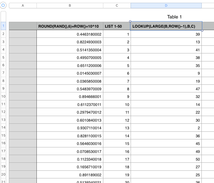 No problem. There was a suggestion to use RANDBETWEEN but you are likely to have duplicates with it. Hiroto's idea is to have a list of the numbers 1-50 and then mix them up. He did not show a function that does the re-ordering (he suggested sorting by the column of random numbers). RAND will work fine for manual sorting but if you want it to be automatic, the formulas I know of require all the random numbers to be unique. RAND() still has a very very very very very extremely unlikely chance of a repeat (did I say "very" enough times? probably not).