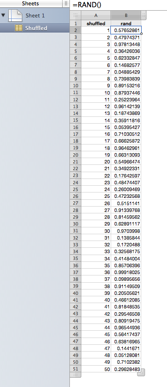 Shuffled (excerpt) A1 shuffled A2 1 A3 2 A4 3 A5 4 B1 rand B2 =RAND() B3 =RAND() B4 =RAND() B5 =RAND()