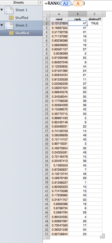 Shuffled (excerpt) A1 rand A2 =RAND() A3 =RAND() A4 =RAND() A5 =RAND() B1 rank B2 =RANK(A2,A) B3 =RANK(A3,A) B4 =RANK(A4,A) B5 =RANK(A5,A) C1 distinct? C2 =ISERROR(MODE(B)) C3 C4 C5