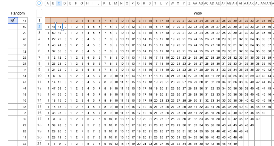 C2=IF(Random::$A$1, RANDBETWEEN(0, MAX($1:$1)−(ROW()−2)), RANDBETWEEN(0, MAX($1:$1)−(ROW()−2)))