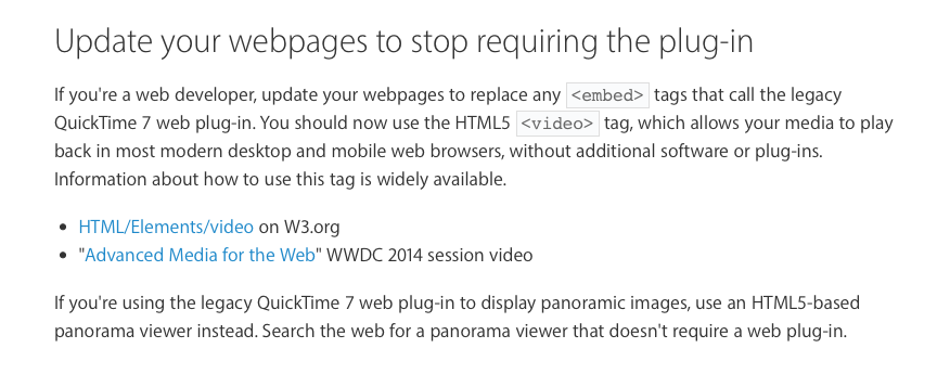 I'm glad Apple has posted an announcement to web developers telling them how to update their websites, however how many web developers check Apple's discussion boards for suggestions on how to ensure their legacy websites are usable to Safari users? The websites I and my wife were having troubles with were online "lectures" for a nutrition class at a local community college. The nutrition instructors that made these sites are not web developers. Apple should make sure they are doing their best to keep compatibility with older sites too. It simply looks bad for Apple when there is a "Missing Plug-In" dialog for a Quicktime movie in Safari on a brand-new iMac. It is only made worse by the fact that when one clicks the dialog and tries to install the plugin, the user is taken to Apple's Quicktime website that goes on to say how Quicktime is included in OS X. It would make a lot more sense to link to a page that either fixes the issue for the user and/or states what changes need to be made to the website to update it.