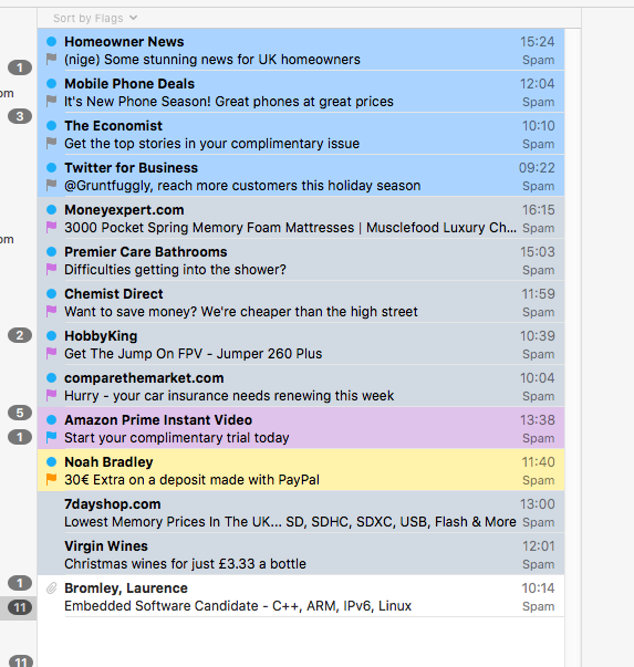 After upgrading to El Capitan, Mail.app does not sort by flags correctly in the message list - it is almost as if it is random the way it displays them. I use this both on a GTD basis (priority) and to check my spam (automagically sorted by SpamSieve). And it is not the plugins that are causing this since I also have tested this without any of them being active.
