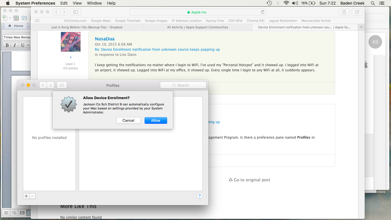 Immediately after upgrading to OS X El Capitan 10.11 I keep getting "Device Enrollment" notifications that I do not recognize or understand. This one says: