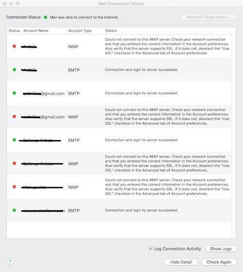 I've tried every combination of settings: changing IMAP ports, SSL/non-SSL, hostnames, IPs, and I've tested on my work network and at home. I've also followed the steps others have posted whereby I've removed accounts, re-installed, I've even set up a brand new account and it has the same problems. It seems the only common component is El Capitan and my MacBook Pro (2015).