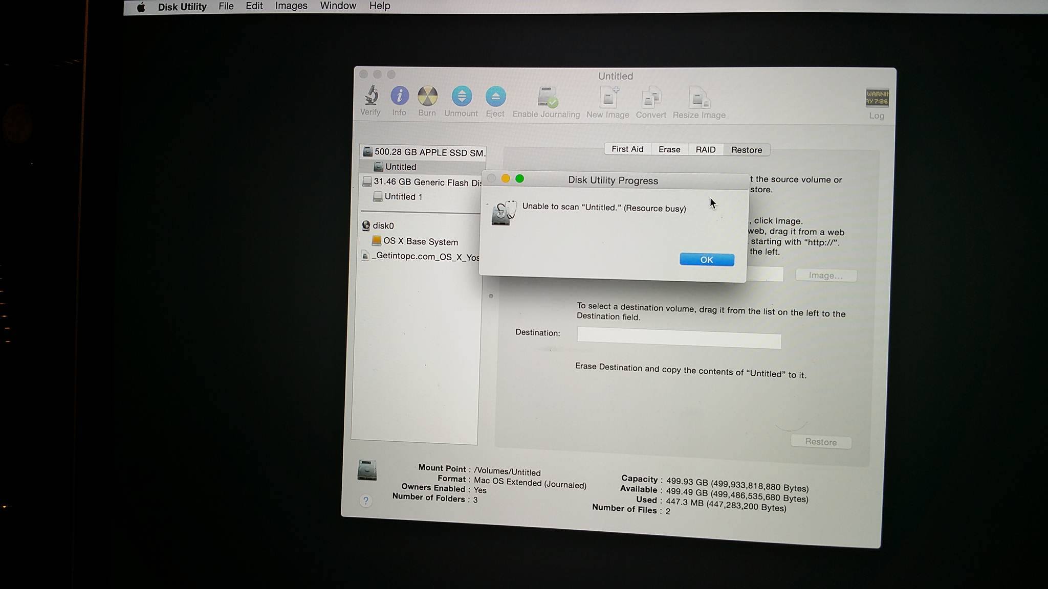 DMG is a fresh installer for Yosemite. It doesn't seem to have a problem with the DMG. I dismounted Untitled to see if that would work but it didn't. Mounted or unmounted it still claims its in use. Same as if I try doing it straight to the hard drive (well, SDD) by selecting the 500.28GB APPLE SSD, again it cames up with the same error when it comes to disk scanning.