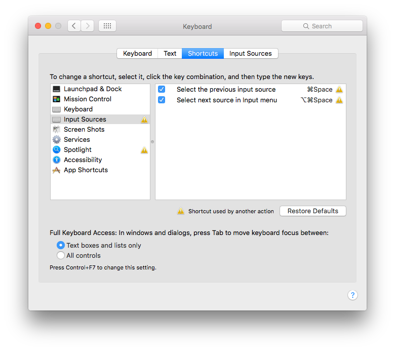 In my case, these two options "Select the previous input source" and the next were activated, with a warning icon at the side, mentioning "This hot key conflicts with other hot keys".