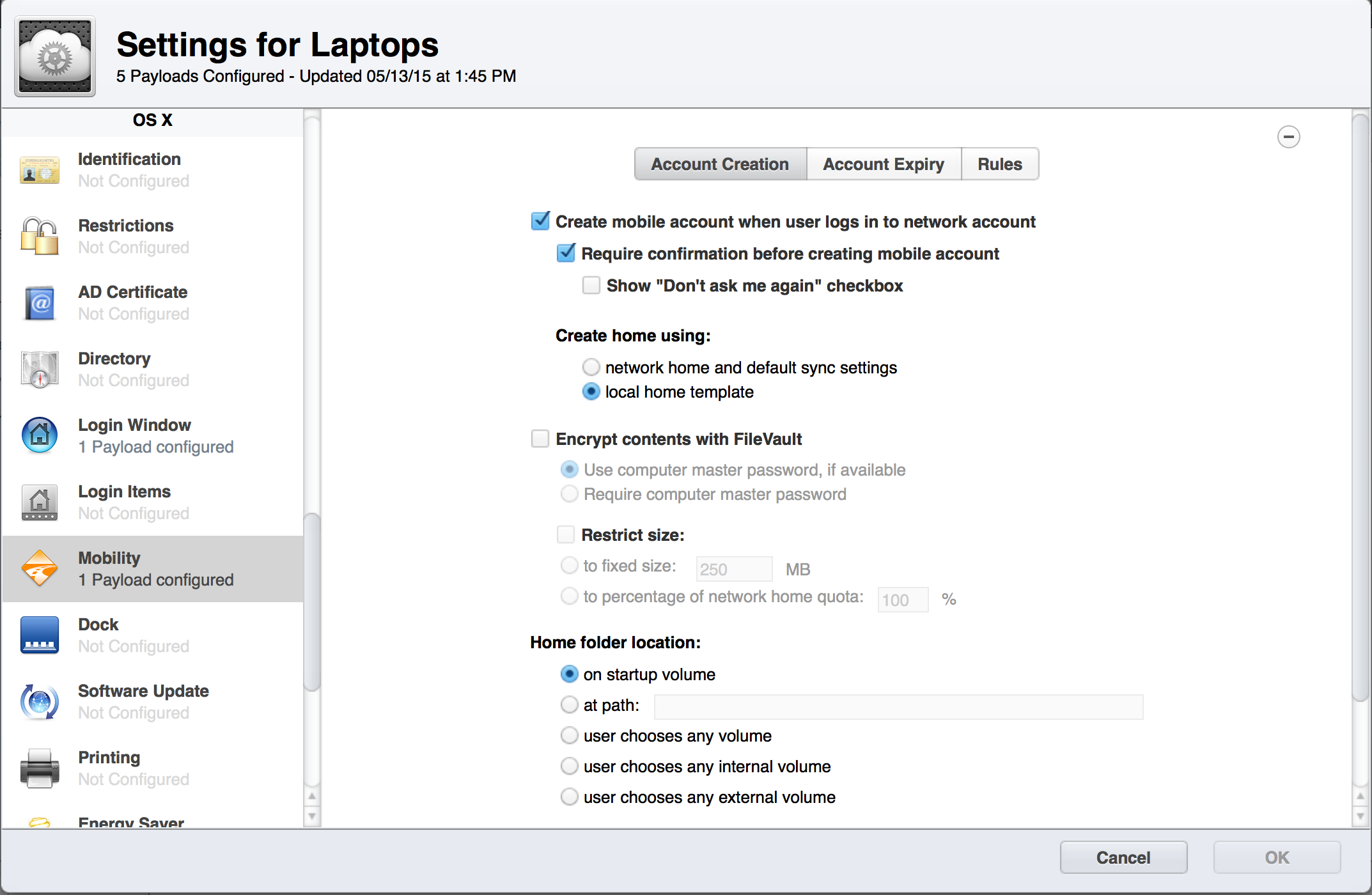It is possible to configure via Workgroup Manager MCX preferences, or preferably these days via Profile Manager which approach is used. It is also possible to present a dialog box when the user logs in offering a choice. If the portable home directory choice is made then thereafter each time the login that portable home directory will continue to be used. Portable home directories are particularly suited to laptops as they can be used even when the laptop is not connected to the network. Password changes between a portable home directory user and Open Directory can be automatically synced so that when you change the password on your client Mac it updates the matching account in Open Directory, remember with a portable home directory account a local account has been created. (Linked to the Open Directory account.)
