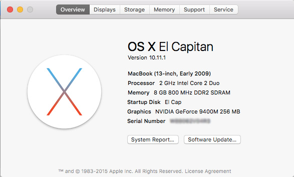 MacBook (13-inch Early 2009), OS X Mountain Lion (10.8.4), Also tried to El Capitan