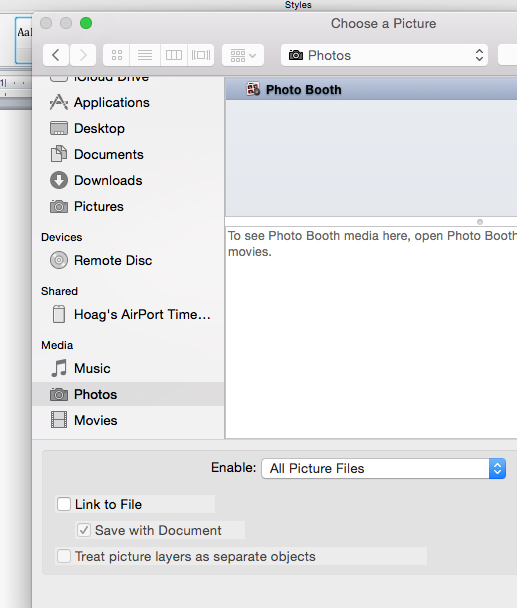My kids have been on my computer and must have done something to it. I can no longer choose photos from "photos" (previously iPhoto) to insert into a word document. When I click insert photo, I used to be able to find my "photos" in the media section of finder under photos. The only thing listed there now is photo booth. How do I get access to photos there again?